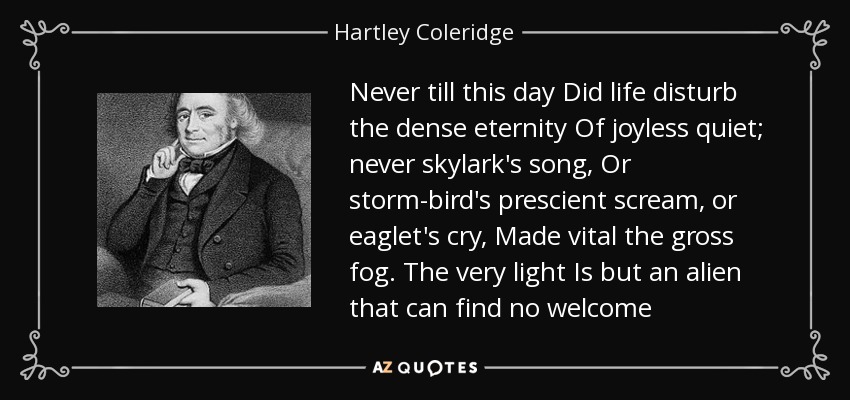 Never till this day Did life disturb the dense eternity Of joyless quiet; never skylark's song, Or storm-bird's prescient scream, or eaglet's cry, Made vital the gross fog. The very light Is but an alien that can find no welcome
