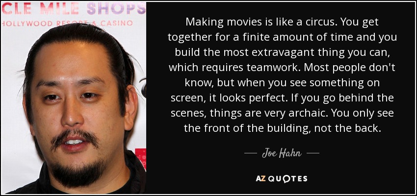 Making movies is like a circus. You get together for a finite amount of time and you build the most extravagant thing you can, which requires teamwork. Most people don't know, but when you see something on screen, it looks perfect. If you go behind the scenes, things are very archaic. You only see the front of the building, not the back.