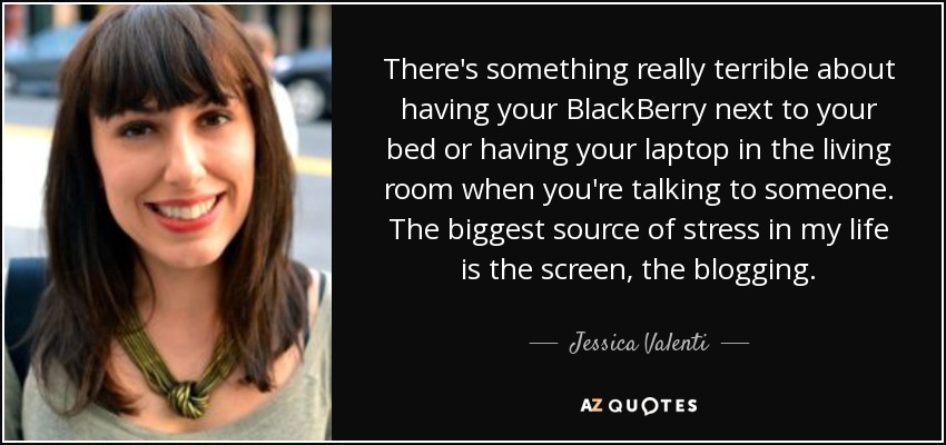 There's something really terrible about having your BlackBerry next to your bed or having your laptop in the living room when you're talking to someone. The biggest source of stress in my life is the screen, the blogging.