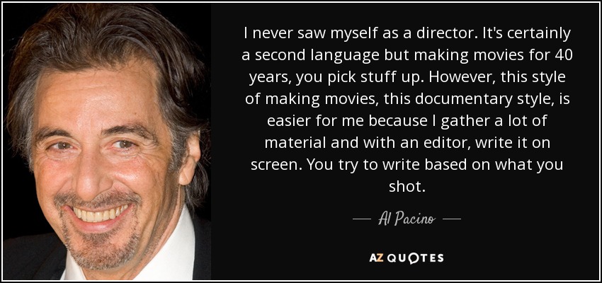 I never saw myself as a director. It's certainly a second language but making movies for 40 years, you pick stuff up. However, this style of making movies, this documentary style, is easier for me because I gather a lot of material and with an editor, write it on screen. You try to write based on what you shot.