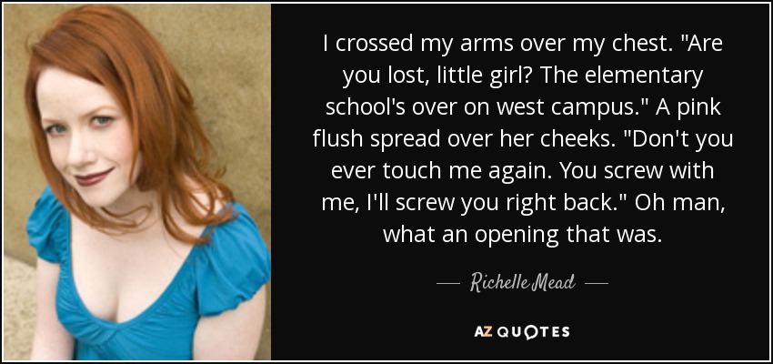 I crossed my arms over my chest. "Are you lost, little girl? The elementary school's over on west campus." A pink flush spread over her cheeks. "Don't you ever touch me again. You screw with me, I'll screw you right back." Oh man, what an opening that was.