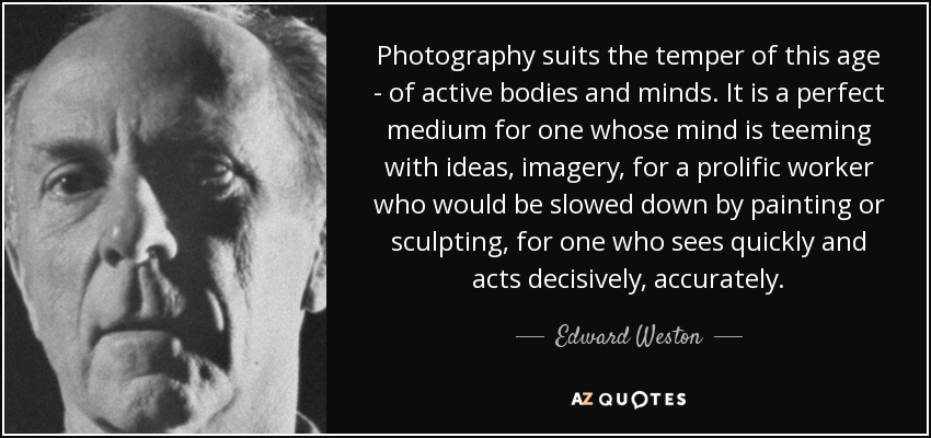Photography suits the temper of this age - of active bodies and minds. It is a perfect medium for one whose mind is teeming with ideas, imagery, for a prolific worker who would be slowed down by painting or sculpting, for one who sees quickly and acts decisively, accurately.