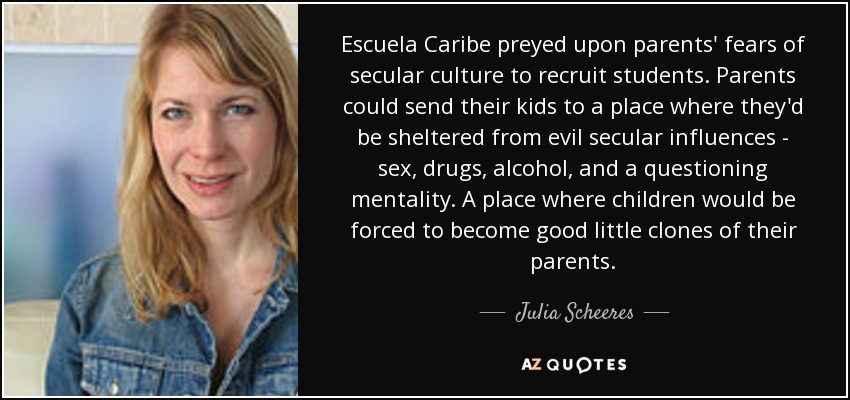 Escuela Caribe preyed upon parents' fears of secular culture to recruit students. Parents could send their kids to a place where they'd be sheltered from evil secular influences - sex, drugs, alcohol, and a questioning mentality. A place where children would be forced to become good little clones of their parents.
