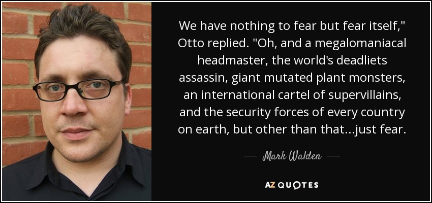 We have nothing to fear but fear itself," Otto replied. "Oh, and a megalomaniacal headmaster, the world's deadliets assassin, giant mutated plant monsters, an international cartel of supervillains, and the security forces of every country on earth, but other than that...just fear.