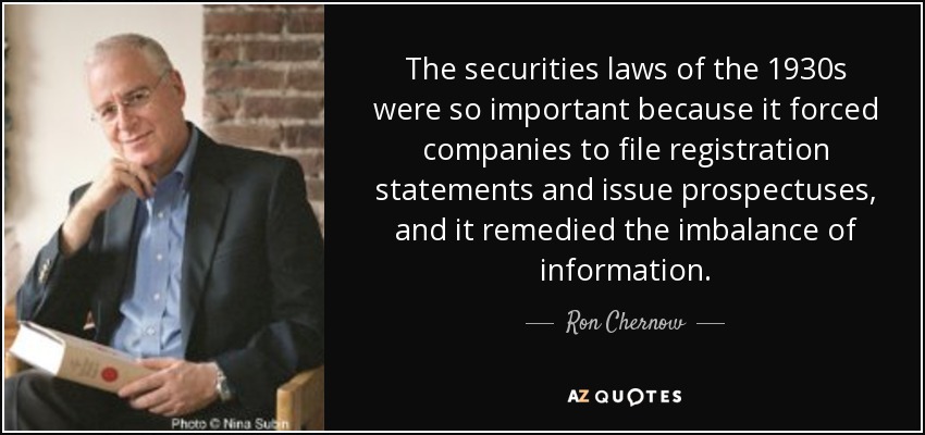 The securities laws of the 1930s were so important because it forced companies to file registration statements and issue prospectuses, and it remedied the imbalance of information.