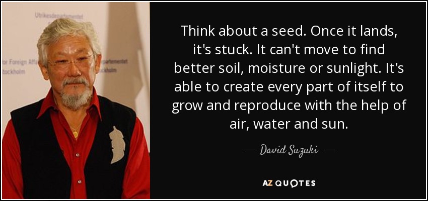Think about a seed. Once it lands, it's stuck. It can't move to find better soil, moisture or sunlight. It's able to create every part of itself to grow and reproduce with the help of air, water and sun.