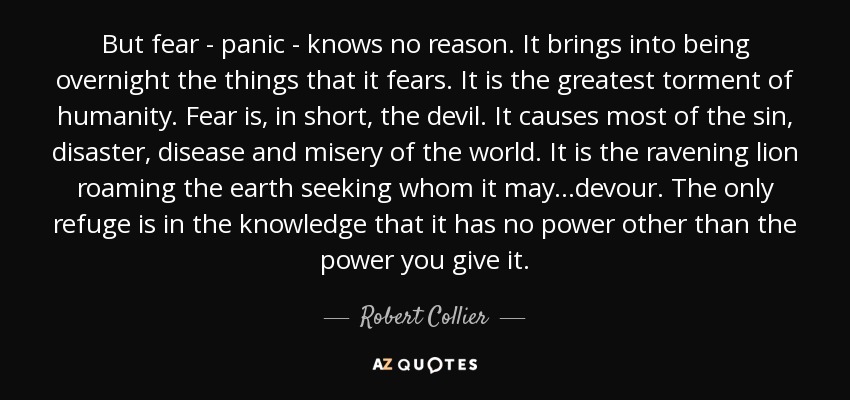 But fear - panic - knows no reason. It brings into being overnight the things that it fears. It is the greatest torment of humanity. Fear is, in short, the devil. It causes most of the sin, disaster, disease and misery of the world. It is the ravening lion roaming the earth seeking whom it may...devour. The only refuge is in the knowledge that it has no power other than the power you give it.
