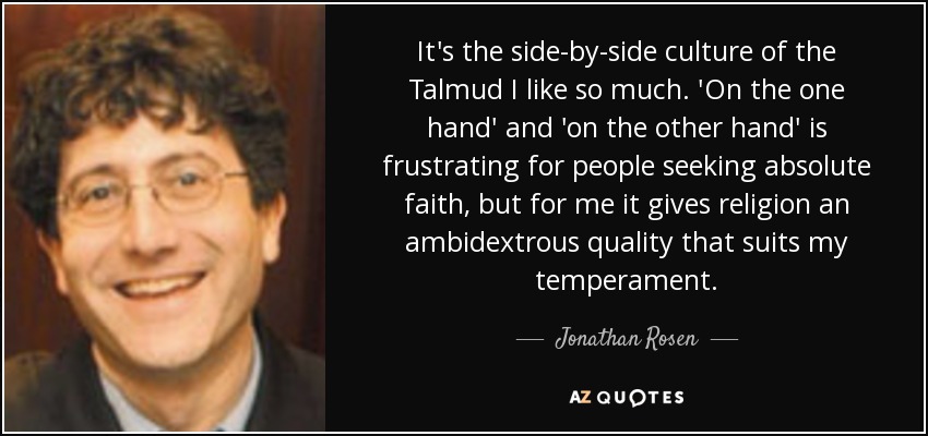 It's the side-by-side culture of the Talmud I like so much. 'On the one hand' and 'on the other hand' is frustrating for people seeking absolute faith, but for me it gives religion an ambidextrous quality that suits my temperament.