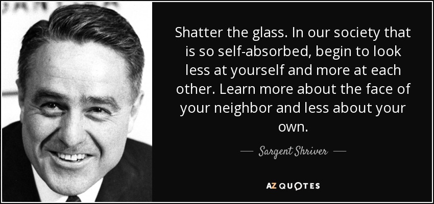 Shatter the glass. In our society that is so self-absorbed, begin to look less at yourself and more at each other. Learn more about the face of your neighbor and less about your own.