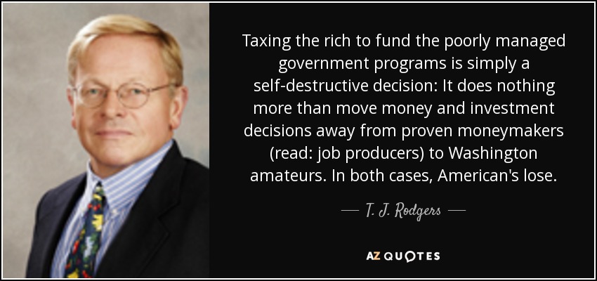 Taxing the rich to fund the poorly managed government programs is simply a self-destructive decision: It does nothing more than move money and investment decisions away from proven moneymakers (read: job producers) to Washington amateurs. In both cases, American's lose.