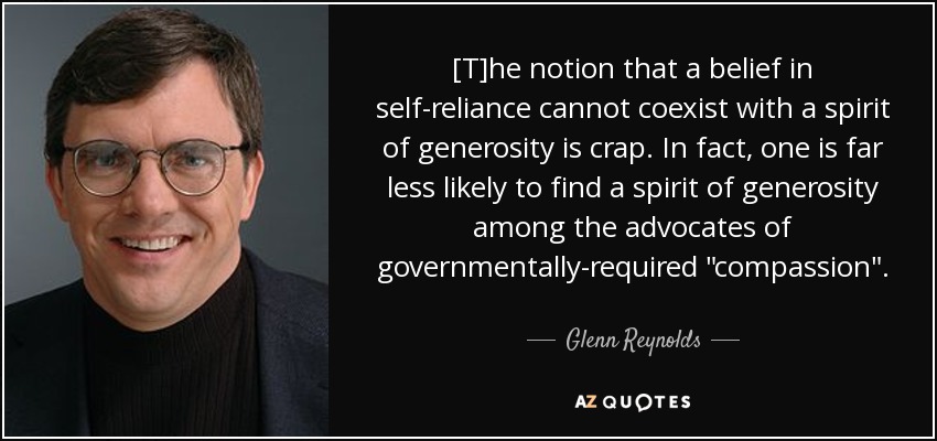 [T]he notion that a belief in self-reliance cannot coexist with a spirit of generosity is crap. In fact, one is far less likely to find a spirit of generosity among the advocates of governmentally-required "compassion".