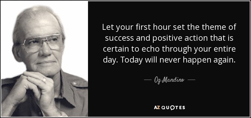 Let your first hour set the theme of success and positive action that is certain to echo through your entire day. Today will never happen again.