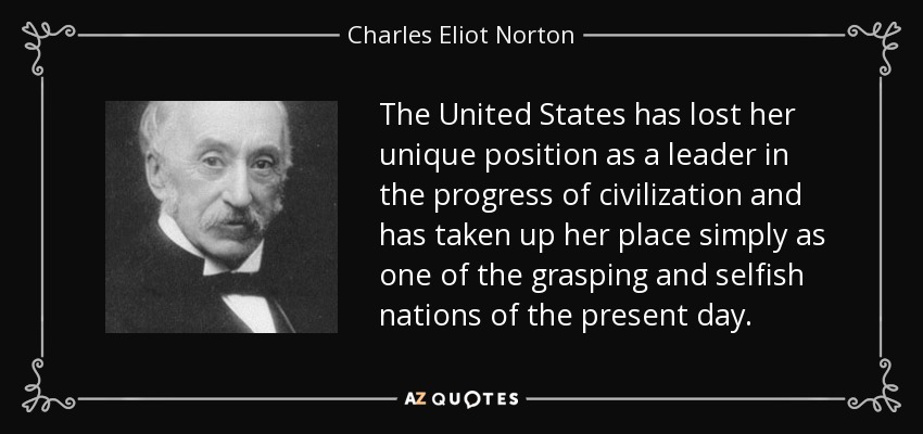 The United States has lost her unique position as a leader in the progress of civilization and has taken up her place simply as one of the grasping and selfish nations of the present day.