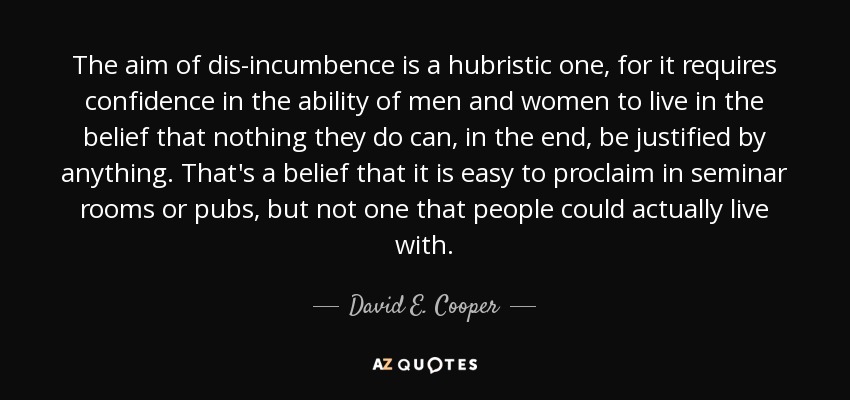 The aim of dis-incumbence is a hubristic one, for it requires confidence in the ability of men and women to live in the belief that nothing they do can, in the end, be justified by anything. That's a belief that it is easy to proclaim in seminar rooms or pubs, but not one that people could actually live with.