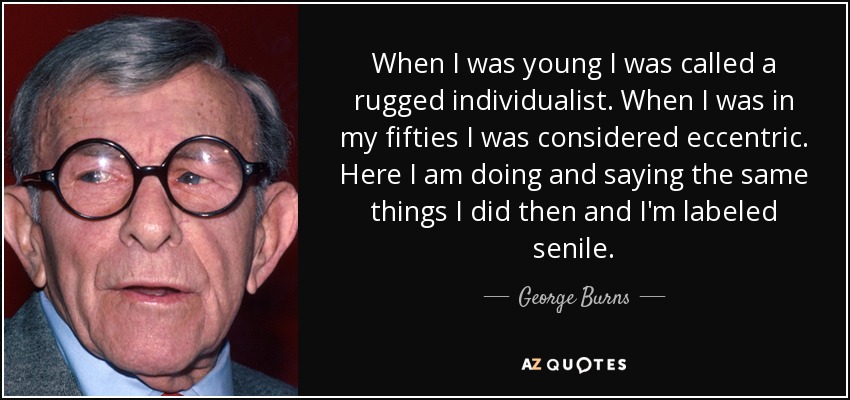 When I was young I was called a rugged individualist. When I was in my fifties I was considered eccentric. Here I am doing and saying the same things I did then and I'm labeled senile.