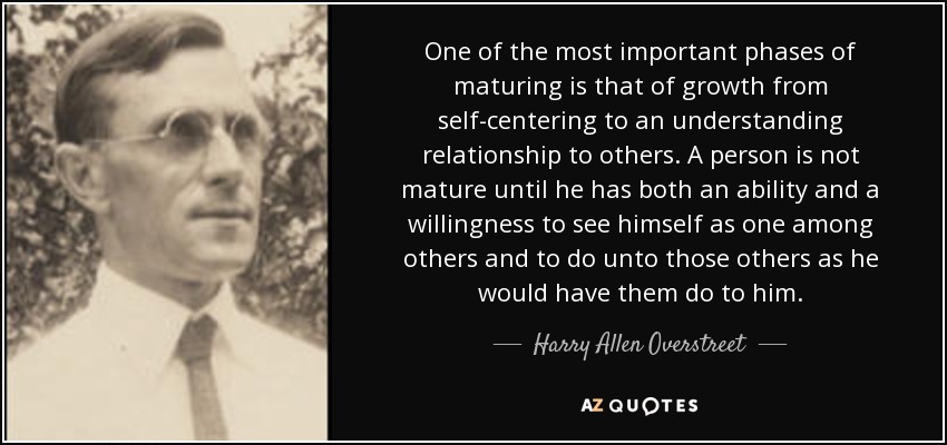 One of the most important phases of maturing is that of growth from self-centering to an understanding relationship to others. A person is not mature until he has both an ability and a willingness to see himself as one among others and to do unto those others as he would have them do to him.