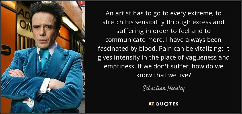 An artist has to go to every extreme, to stretch his sensibility through excess and suffering in order to feel and to communicate more. I have always been fascinated by blood. Pain can be vitalizing; it gives intensity in the place of vagueness and emptiness. If we don't suffer, how do we know that we live?