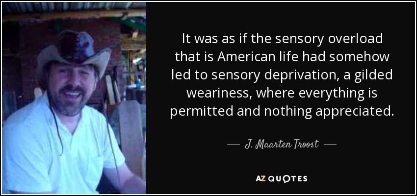 It was as if the sensory overload that is American life had somehow led to sensory deprivation, a gilded weariness, where everything is permitted and nothing appreciated.