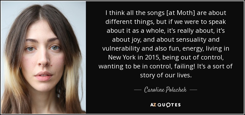 I think all the songs [at Moth] are about different things, but if we were to speak about it as a whole, it's really about, it's about joy, and about sensuality and vulnerability and also fun, energy, living in New York in 2015, being out of control, wanting to be in control, failing! It's a sort of story of our lives.