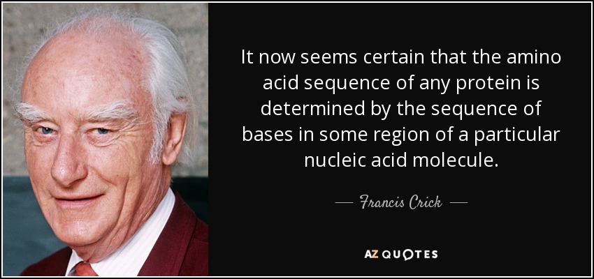 It now seems certain that the amino acid sequence of any protein is determined by the sequence of bases in some region of a particular nucleic acid molecule.