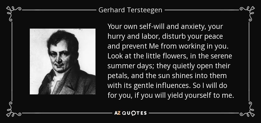 Your own self-will and anxiety, your hurry and labor, disturb your peace and prevent Me from working in you. Look at the little flowers, in the serene summer days; they quietly open their petals, and the sun shines into them with its gentle influences. So I will do for you, if you will yield yourself to me.