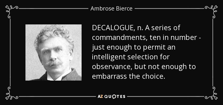DECALOGUE, n. A series of commandments, ten in number - just enough to permit an intelligent selection for observance, but not enough to embarrass the choice.