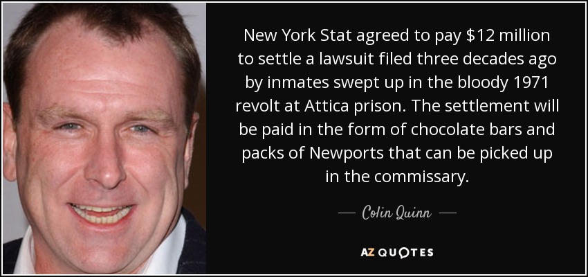 New York Stat agreed to pay $12 million to settle a lawsuit filed three decades ago by inmates swept up in the bloody 1971 revolt at Attica prison. The settlement will be paid in the form of chocolate bars and packs of Newports that can be picked up in the commissary.