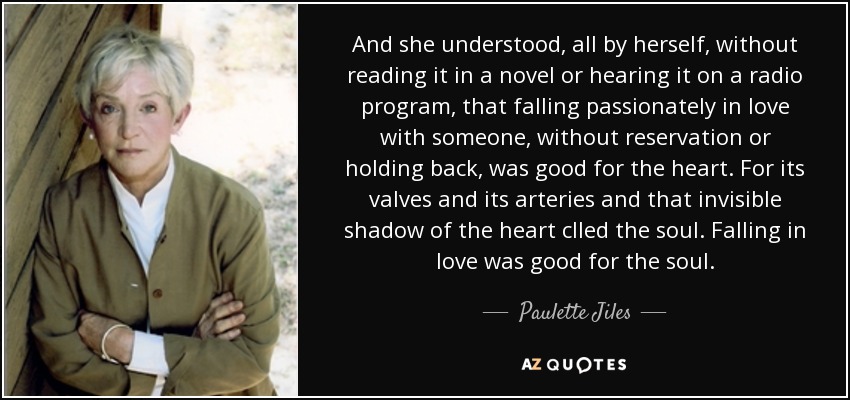 And she understood, all by herself, without reading it in a novel or hearing it on a radio program, that falling passionately in love with someone, without reservation or holding back, was good for the heart. For its valves and its arteries and that invisible shadow of the heart clled the soul. Falling in love was good for the soul.