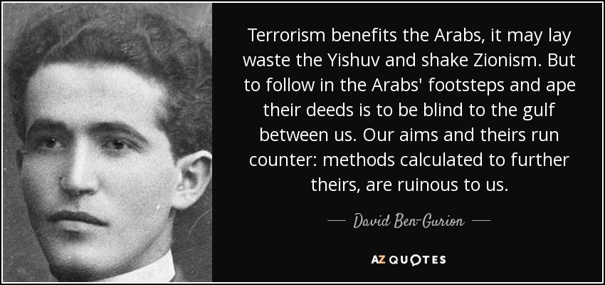 Terrorism benefits the Arabs, it may lay waste the Yishuv and shake Zionism. But to follow in the Arabs' footsteps and ape their deeds is to be blind to the gulf between us. Our aims and theirs run counter: methods calculated to further theirs, are ruinous to us.