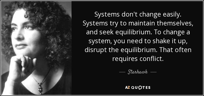 Systems don't change easily. Systems try to maintain themselves, and seek equilibrium. To change a system, you need to shake it up, disrupt the equilibrium. That often requires conflict.