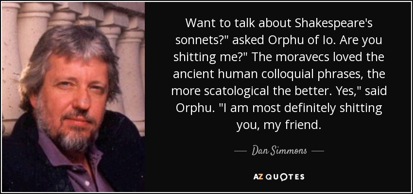 Want to talk about Shakespeare's sonnets?" asked Orphu of Io. Are you shitting me?" The moravecs loved the ancient human colloquial phrases, the more scatological the better. Yes," said Orphu. "I am most definitely shitting you, my friend.