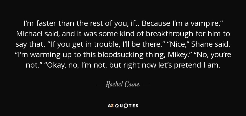 I’m faster than the rest of you, if .. Because I’m a vampire,” Michael said, and it was some kind of breakthrough for him to say that. “If you get in trouble, I’ll be there.” “Nice,” Shane said. “I’m warming up to this bloodsucking thing, Mikey.” “No, you’re not.” “Okay, no, I’m not, but right now let’s pretend I am.