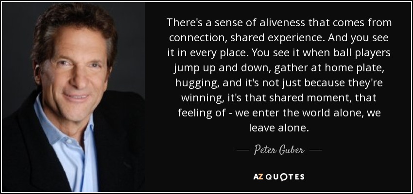 There's a sense of aliveness that comes from connection, shared experience. And you see it in every place. You see it when ball players jump up and down, gather at home plate, hugging, and it's not just because they're winning, it's that shared moment, that feeling of - we enter the world alone, we leave alone.