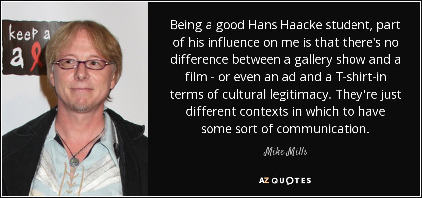 Being a good Hans Haacke student, part of his influence on me is that there's no difference between a gallery show and a film - or even an ad and a T-shirt-in terms of cultural legitimacy. They're just different contexts in which to have some sort of communication.