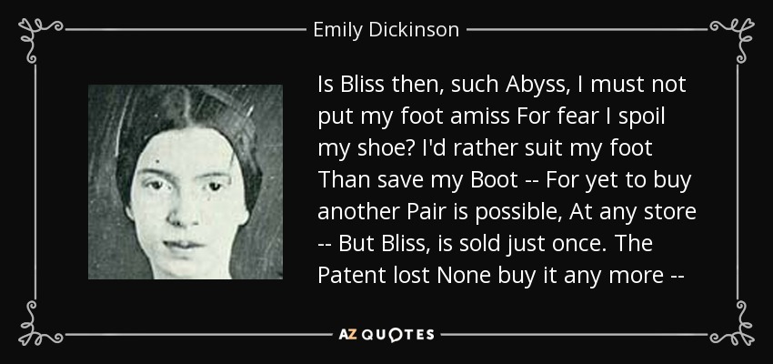 Is Bliss then, such Abyss, I must not put my foot amiss For fear I spoil my shoe? I'd rather suit my foot Than save my Boot -- For yet to buy another Pair is possible, At any store -- But Bliss, is sold just once. The Patent lost None buy it any more --