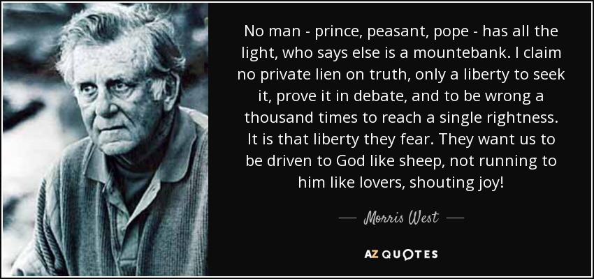 No man - prince, peasant, pope - has all the light, who says else is a mountebank. I claim no private lien on truth, only a liberty to seek it, prove it in debate, and to be wrong a thousand times to reach a single rightness. It is that liberty they fear. They want us to be driven to God like sheep, not running to him like lovers, shouting joy!