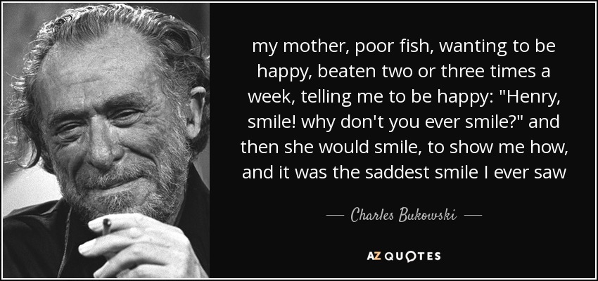 my mother, poor fish, wanting to be happy, beaten two or three times a week, telling me to be happy: "Henry, smile! why don't you ever smile?" and then she would smile, to show me how, and it was the saddest smile I ever saw