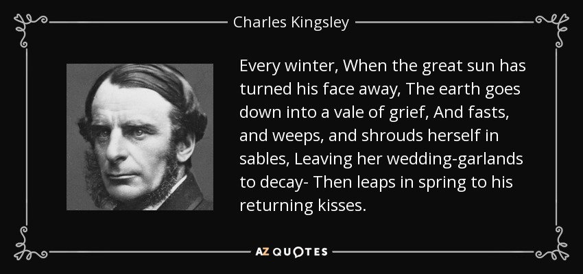 Every winter, When the great sun has turned his face away, The earth goes down into a vale of grief, And fasts, and weeps, and shrouds herself in sables, Leaving her wedding-garlands to decay- Then leaps in spring to his returning kisses.