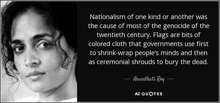 Nationalism of one kind or another was the cause of most of the genocide of the twentieth century. Flags are bits of colored cloth that governments use first to shrink-wrap people's minds and then as ceremonial shrouds to bury the dead.