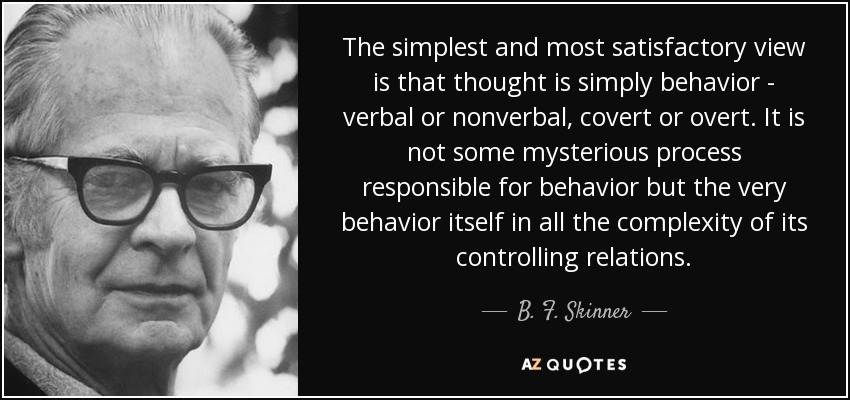 The simplest and most satisfactory view is that thought is simply behavior - verbal or nonverbal, covert or overt. It is not some mysterious process responsible for behavior but the very behavior itself in all the complexity of its controlling relations.