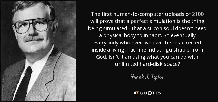 The first human-to-computer uploads of 2100 will prove that a perfect simulation is the thing being simulated - that a silicon soul doesn't need a physical body to inhabit. So eventually everybody who ever lived will be resurrected inside a living machine indistinguishable from God. Isn't it amazing what you can do with unlimited hard-disk space?