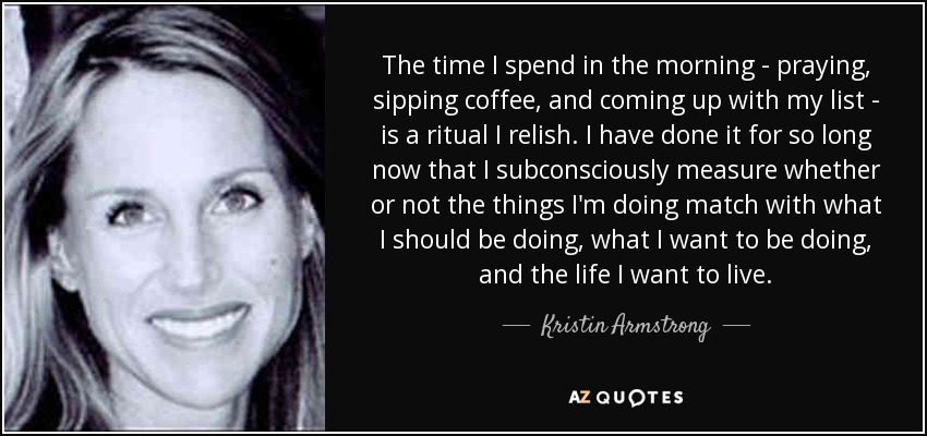 The time I spend in the morning - praying, sipping coffee, and coming up with my list - is a ritual I relish. I have done it for so long now that I subconsciously measure whether or not the things I'm doing match with what I should be doing, what I want to be doing, and the life I want to live.