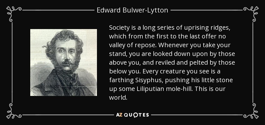 Society is a long series of uprising ridges, which from the first to the last offer no valley of repose. Whenever you take your stand, you are looked down upon by those above you, and reviled and pelted by those below you. Every creature you see is a farthing Sisyphus, pushing his little stone up some Liliputian mole-hill. This is our world.
