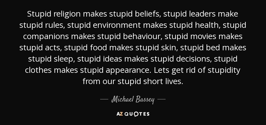 Stupid religion makes stupid beliefs, stupid leaders make stupid rules, stupid environment makes stupid health, stupid companions makes stupid behaviour, stupid movies makes stupid acts, stupid food makes stupid skin, stupid bed makes stupid sleep, stupid ideas makes stupid decisions, stupid clothes makes stupid appearance. Lets get rid of stupidity from our stupid short lives.
