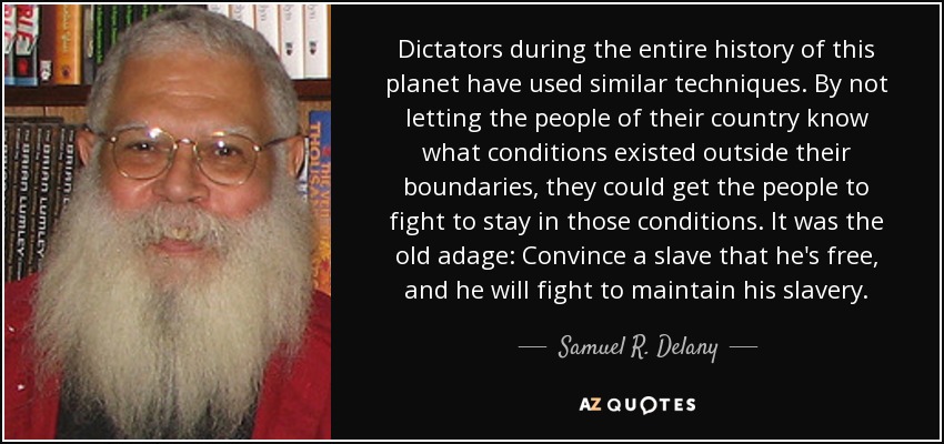Dictators during the entire history of this planet have used similar techniques. By not letting the people of their country know what conditions existed outside their boundaries, they could get the people to fight to stay in those conditions. It was the old adage: Convince a slave that he's free , and he will fight to maintain his slavery .