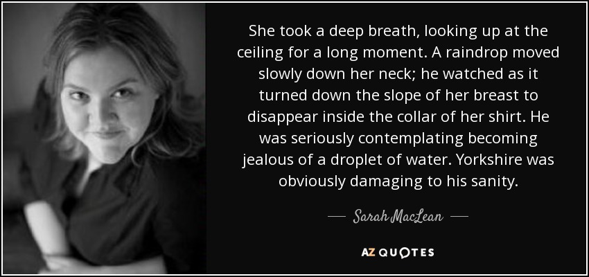 She took a deep breath, looking up at the ceiling for a long moment. A raindrop moved slowly down her neck; he watched as it turned down the slope of her breast to disappear inside the collar of her shirt. He was seriously contemplating becoming jealous of a droplet of water. Yorkshire was obviously damaging to his sanity.