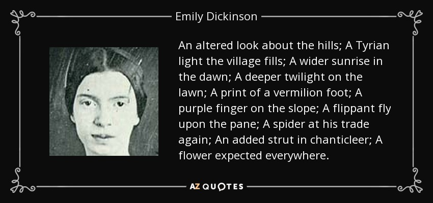 An altered look about the hills; A Tyrian light the village fills; A wider sunrise in the dawn; A deeper twilight on the lawn; A print of a vermilion foot; A purple finger on the slope; A flippant fly upon the pane; A spider at his trade again; An added strut in chanticleer; A flower expected everywhere.