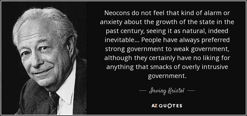 Neocons do not feel that kind of alarm or anxiety about the growth of the state in the past century, seeing it as natural, indeed inevitable ... People have always preferred strong government to weak government, although they certainly have no liking for anything that smacks of overly intrusive government.