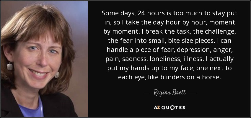 Some days, 24 hours is too much to stay put in, so I take the day hour by hour, moment by moment. I break the task, the challenge, the fear into small, bite-size pieces. I can handle a piece of fear, depression, anger, pain, sadness, loneliness, illness. I actually put my hands up to my face, one next to each eye, like blinders on a horse.
