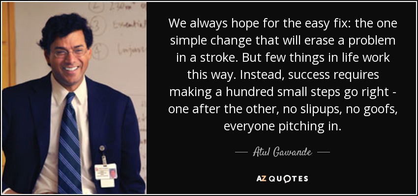 We always hope for the easy fix: the one simple change that will erase a problem in a stroke. But few things in life work this way. Instead, success requires making a hundred small steps go right - one after the other, no slipups, no goofs, everyone pitching in.